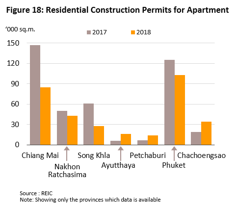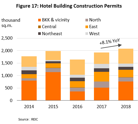 กรุงเทพฯ และปริมณฑลมีพื้นที่ขออนุญาตก่อสร้างโรงแรมมากที่สุดคิดเป็นสัดส่วน 37% ของพื้นที่ขออนุญาตก่อสร้างโรงแรมทั่วประเทศ เพิ่มขึ้น 46.0% YoY สะท้อนศักยภาพด้านการท่องเที่ยวของพื้นที่ยังมีอยู่มาก รองลงมา คือ ภาคใต้ (สัดส่วน 29%) เพิ่มขึ้น 33% YoY โดยภูเก็ตยังคงเป็นที่สนใจของนักลงทุนมากเป็นอันดับ 1 ในภาคนี้ (สัดส่วน 77% ของพื้นที่ขออนุญาตก่อสร้างโรงแรมในภาคใต้) เนื่องจากนักลงทุนยังมีความเชื่อมั่นในศักยภาพด้านการท่องเที่ยวของภูเก็ตที่จะยังสามารถดึงดูดนักท่องเที่ยวได้อย่างต่อเนื่องโดยเฉพาะนักท่องเที่ยวต่างชาติจากตลาดใหม่ๆ (นอกเหนือจากจีน) ส่วนภาคตะวันออก (สัดส่วน 14%) นำโดยชลบุรี (65% ของพื้นที่ขออนุญาตก่อสร้างโรงแรมในภาคตะวันออก) ขับเคลื่อนโดยพัทยาซึ่งยังเป็น Tourist destinations ระดับโลกที่สามารถดึงดูดโครงการก่อสร้างโรงแรมใหม่ๆ อย่างไรก็ตาม พื้นที่ขออนุญาตก่อสร้างโรงแรมในชลบุรีปี 2561 มีจำนวน 1.9 แสน ตร.ม. หดตัวถึง 40% YoY ส่วนหนึ่งเป็นผลจากมีการขออนุญาตก่อสร้างไปมากแล้วเมื่อปี 2560 (3.2 แสน ตร.ม.) กอปรกับพื้นที่ศักยภาพโดยเฉพาะบริเวณติดชายหาดราคาปรับสูงขึ้นมากและหายาก ส่งผลให้การลงทุนในธุรกิจโรงแรมมีการขยายออกไปยังพื้นที่ใกล้เคียงมากขึ้น อาทิ ระยอง มีพื้นที่ขออนุญาตก่อสร้างเพิ่มขึ้นมากกว่า 200% เพื่อรองรับอุปสงค์จากภาคท่องเที่ยวและอุตสาหกรรมที่คาดว่าจะเพิ่มขึ้นหลังโครงการ EEC ดำเนินการแล้วเสร็จ