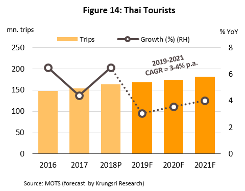 - นักท่องเที่ยวคนไทยเดินทางท่องเที่ยวในประเทศทั้งสิ้น 164 ล้านทริป ขยายตัว 3.6% YoY ผลพวงจากการเติบโตของเศรษฐกิจไทยและการขยายตัวของการท่องเที่ยวในเมืองรองที่ได้อานิสงส์จากการขยายเส้นทางบินของสายการบิน สะท้อนจากจำนวนเที่ยวบินในประเทศ (Domestic Aircraft Movement) เพิ่มขึ้น 1.1%YoY (ข้อมูลจาก บมจ.การท่าอากาศยานไทย) รวมทั้งนโยบายส่งเสริมการท่องเที่ยวในประเทศ โดยเฉพาะมาตรการส่งเสริมการท่องเที่ยวเมืองรอง 55 จังหวัด[4] (1 มกราคม – 31 ธันวาคม 2561) ซึ่งนักท่องเที่ยวสามารถนำใบเสร็จค่าใช้จ่ายจากการท่องเที่ยว (ค่าที่พัก ค่ามัคคุเทศก์ ค่าซื้อแพ็กเกจทัวร์ท่องเที่ยว) มาลดหย่อนภาษีเงินได้บุคคลธรรมดาสูงสุดไม่เกิน 15,000 บาท/ปี