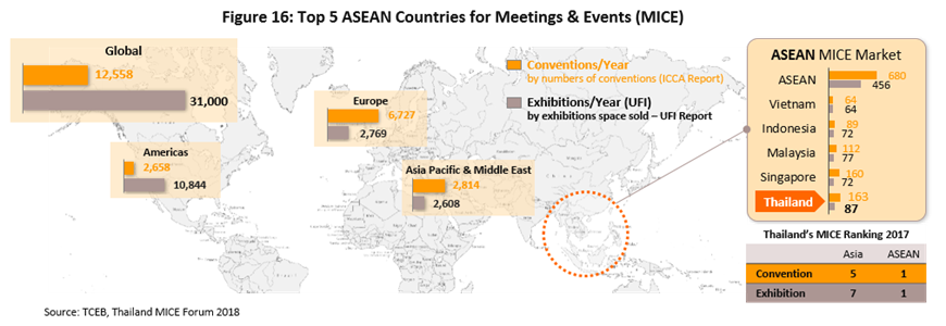 - นักท่องเที่ยวกลุ่ม MICE[5] (Meetings, Incentives, Conventions and Exhibitions) ทวีความสำคัญต่อธุรกิจโรงแรมมากขึ้น โดยนักท่องเที่ยวกลุ่มนี้มีการเติบโตอย่างต่อเนื่อง ล่าสุดไตรมาส 1 ปี 2562 ไทยมีนักท่องเที่ยวกลุ่มไมซ์ทั้งคนไทยและต่างชาติรวมกันกว่า 8.1 ล้านคน (+2.9% YoY) จำแนกเป็นคนไทย 7.8 ล้านคน ต่างชาติ 3.5 แสนคน สร้างรายได้ 5.5 หมื่นล้านบาท (+6.3% YoY) และปัจจุบันไทยเป็น MICE Destination อันดับ 1 ในภูมิภาคอาเซียน (ภาพที่ 16) ด้านการจัดประชุมและนิทรรศการ (Convention & Exhibition) ดังนั้น โรงแรมที่รับนักท่องเที่ยวกลุ่ม MICE จึงมีรายได้จากค่าห้องพัก การเช่าห้องประชุม ตลอดจนค่าอาหารและเครื่องดื่มจากการจัดเลี้ยงเพิ่มขึ้นเมื่อเทียบกับนักท่องเที่ยวทั่วไป จึงเป็นแหล่งรายได้สำคัญของธุรกิจโรงแรมโดยเฉพาะโรงแรมระดับ 4-5 ดาว เนื่องจากนักท่องเที่ยวกลุ่มนี้ (โดยเฉพาะนักท่องเที่ยวต่างชาติ) ต้องการสินค้าและบริการที่มีคุณภาพสูงกว่านักท่องเที่ยวทั่วไป จึงมีการใช้จ่ายสูงตามไปด้วย ทั้งนี้ในปีงบประมาณ 2562 คาดไทยจะมีรายได้จากนักท่องเที่ยวกลุ่มไมซ์ทั้งไทยและต่างชาติรวม 2.2 แสนล้านบาท เพิ่มขึ้น 4.0%YoY