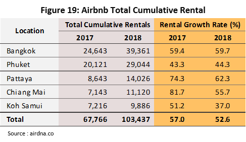นอกจากนี้กระแสเศรษฐกิจแบบแบ่งปัน (Sharing Economy) ยังส่งผลให้เกิดสถานพักแรมที่จองผ่าน Booking Platform (ตัวกลางสำหรับผู้ให้เช่าและผู้เช่า) เช่น Airbnb ซึ่งราคาต่ำกว่าโรงแรมและมีหลากหลายรูปแบบให้เลือก ตั้งแต่บ้านเดี่ยวแบ่งให้เช่าบางห้องและทั้งหลังจนถึงคอนโดมิเนียม ซึ่งอัตราการเช่าผ่าน Booking Platform ในพื้นที่ท่องเที่ยวหลักและพื้นที่ท่องเที่ยวสำคัญอื่นๆ ของไทยขยายตัวสูง (ภาพที่ 19) ทั้งนี้ แม้จะมีปริมาณไม่มากในปัจจุบัน (ประมาณ 10% ของจำนวนห้องพักในโรงแรมและรีสอร์ทใน 5 แหล่งท่องเที่ยวหลัก ได้แก่ กรุงเทพฯ พัทยา ภูเก็ต เกาะสมุย และเชียงใหม่ (ข้อมูลจากกรมการท่องเที่ยว, Colliers International และ Airdna, กันยายน 2559) และยังไม่ส่งผลกระทบต่อธุรกิจโรงแรมเท่าใดนัก แต่ในอนาคตอาจกดดันรายได้และผลกำไรของธุรกิจโรงแรมที่เน้นลูกค้ากลุ่มเดียวกัน