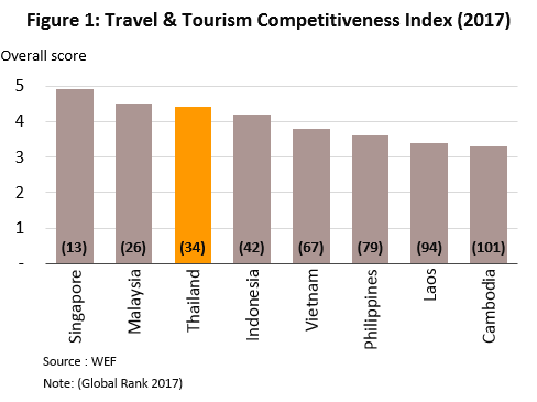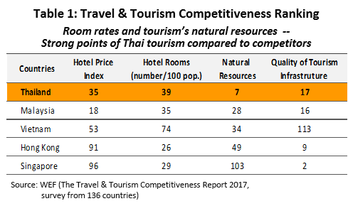 ประเทศไทยนับเป็นจุดหมายปลายทางยอดนิยมแห่งหนึ่งของนักท่องเที่ยวต่างชาติ จากการมีแหล่งท่องเที่ยวที่ดึงดูดความสนใจติดอันดับโลกกระจายอยู่ตามภาคต่างๆ ทั่วประเทศ โดยกรุงเทพฯ เป็นเมืองท่องเที่ยวหลักที่ได้รับความนิยมสูง สะท้อนจากรางวัลที่ได้รับจากหน่วยงานต่างประเทศอย่างต่อเนื่อง นอกจากนี้ภาคใต้/ภาคตะวันออกยังมีแหล่งท่องเที่ยวทางทะเลที่มีชื่อเสียง และพื้นที่หลายจังหวัดในภาคเหนือยังเป็นแหล่งท่องเที่ยวเชิงอนุรักษ์อีกด้วย นอกจากนี้ประเทศไทยยังมีความได้เปรียบในด้านราคาห้องพักและค่าครองชีพที่อยู่ในระดับต่ำ ทำให้การท่องเที่ยวในไทยมีความคุ้มค่าเงิน (Value for money) กอปรกับการคมนาคมที่สะดวกมากขึ้นจากโครงสร้างพื้นฐานที่ทยอยพัฒนาเป็นลำดับ ทั้งนี้ ดัชนีขีดความสามารถในการแข่งขันด้านการท่องเที่ยว (Travel & Tourism Competitiveness Index) ล่าสุดปี 2560 ของ World Economic Forum จัดให้ไทยอยู่อันดับ 34 จากทั้งหมด 136 ประเทศทั่วโลก และอันดับ 3 ในภูมิภาคเอเชียตะวันออกเฉียงใต้รองจากสิงคโปร์และมาเลเซีย (ภาพที่ 1) โดยเฉพาะความสามารถทางการแข่งขันด้านทรัพยากรธรรมชาติของไทยมีอันดับที่ดีที่สุดเมื่อเทียบกับประเทศอื่นๆ ในภูมิภาคเอเชียแปซิฟิก (ตารางที่ 1)