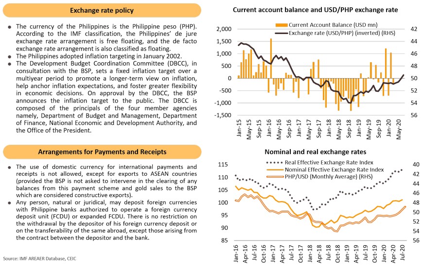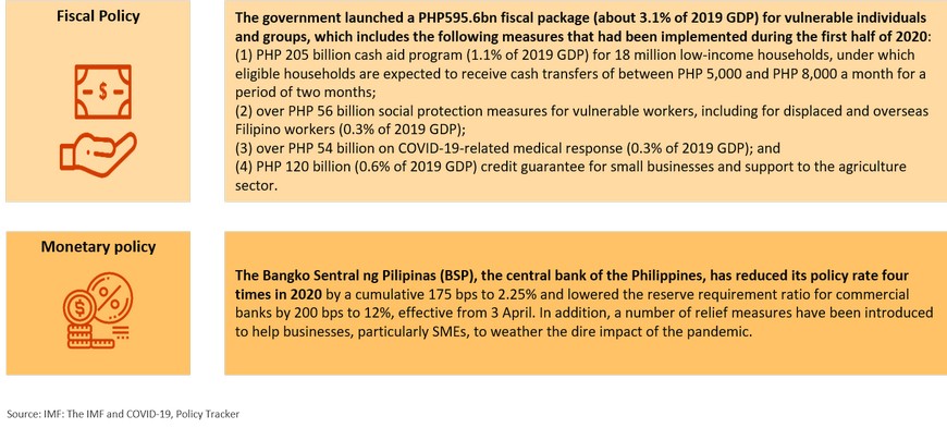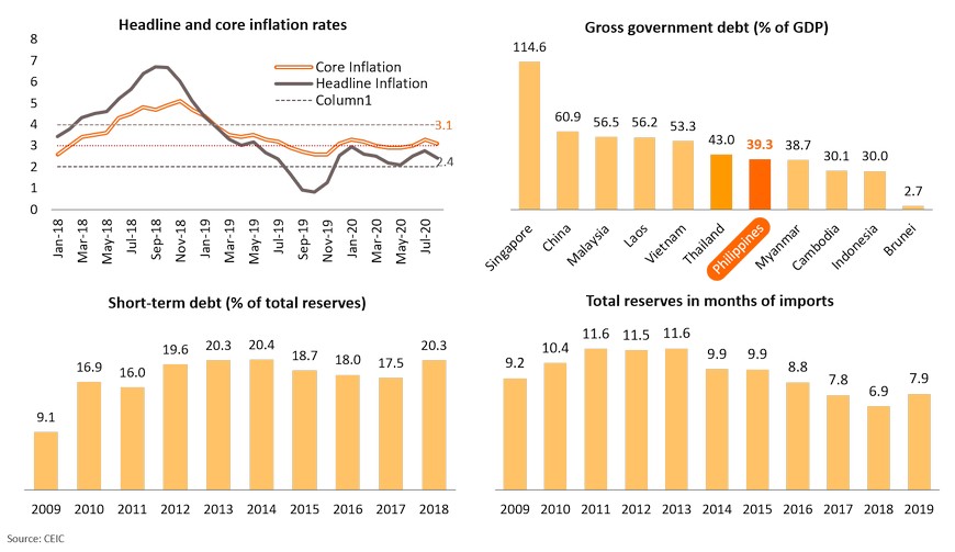 The Philippines reported its first cases of confirmed COVID-19 on 30 January 2020. Recently, on 19 August 2020, the government has moved Metro Manila and other high-risk areas from a “modified enhanced community quarantine” to a “general community quarantine,” allowing more businesses to reopen and mass transportation to resume in phases. International travel restrictions largely remain in place, but domestic flights are allowed under limited capacity. Financial market volatility has subsided recently, with the USD/PHP exchange rate staying stable. Meanwhile, real GDP in the first quarter and second quarter of 2020 contracted by 0.7% and 16.5%, respectively, on a year-on-year basis. This therefore marks the technical recession for the Philippines.