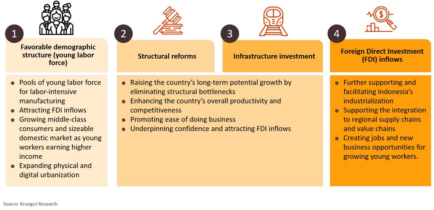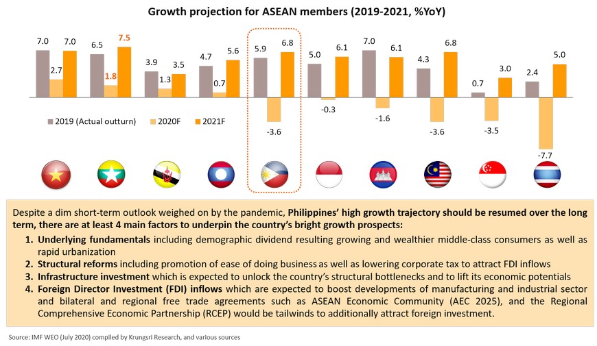 Although the pandemic is expected to substantially erode the Philippines’ potential growth path, over the medium to long term, we view that the economy should be able to eventually follow its potential trajectory of 6.0%-7.0%. There are 4 main drivers comprising (1) demographic dividend, (2) structural reforms, (3) infrastructure investment, and (4) foreign direct investment (FDI) inflows. These factors will enable the Philippines to remain one of the fastest growing economies regionally.