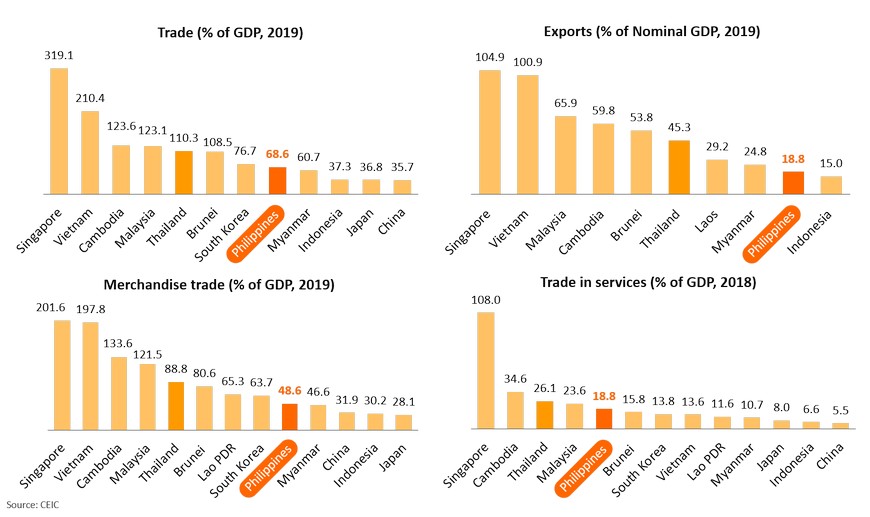 Due to its less-advanced export-oriented manufacturing sector compared to that of regional peers in ASEAN, the Philippines has been less dependent on international trade (both merchandise trade and trade in services), with the trade-to-GDP ratio of 68.6% (as of 2019) compared to 123.1% of Malaysia and 110.3% of Thailand.