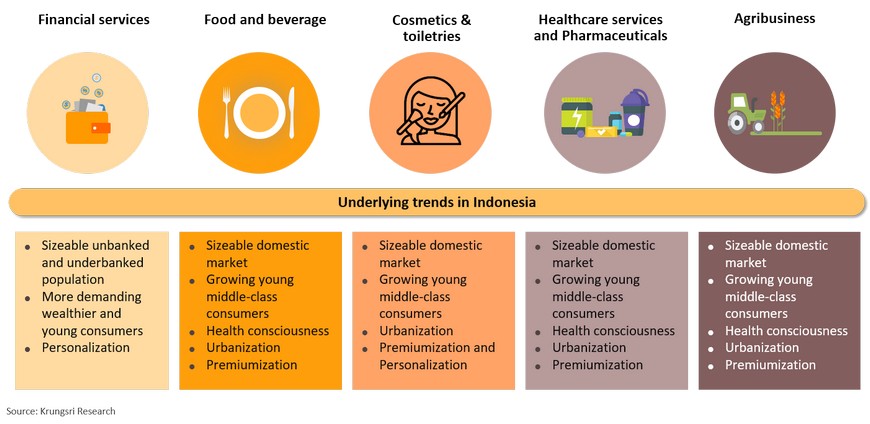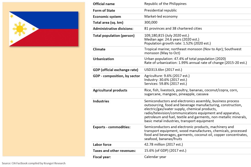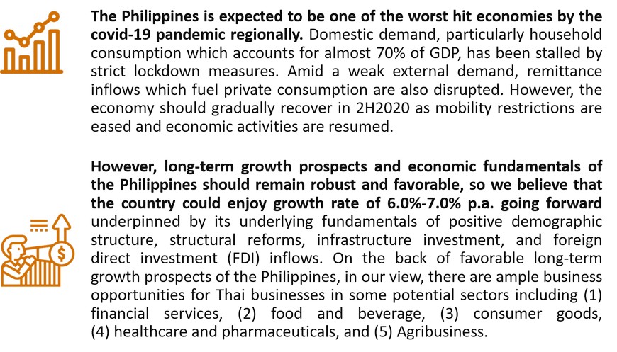 The Philippines will become home for around 124 million inhabitants by 2030. On the back of high economic growth, this would mean that there would be a sizeable young and wealthier consumers. Therefore, looking ahead, the Philippines should remain one of the most vibrant economies regionally and provide business opportunities for Thai firms seeking markets to grow their business in the region. And, some potential sectors that are on the top of our mind are (1) financial services, (2) food and beverage, (3) Cosmetics & toiletries, (4) healthcare and pharmaceuticals, and (5) Agribusiness.