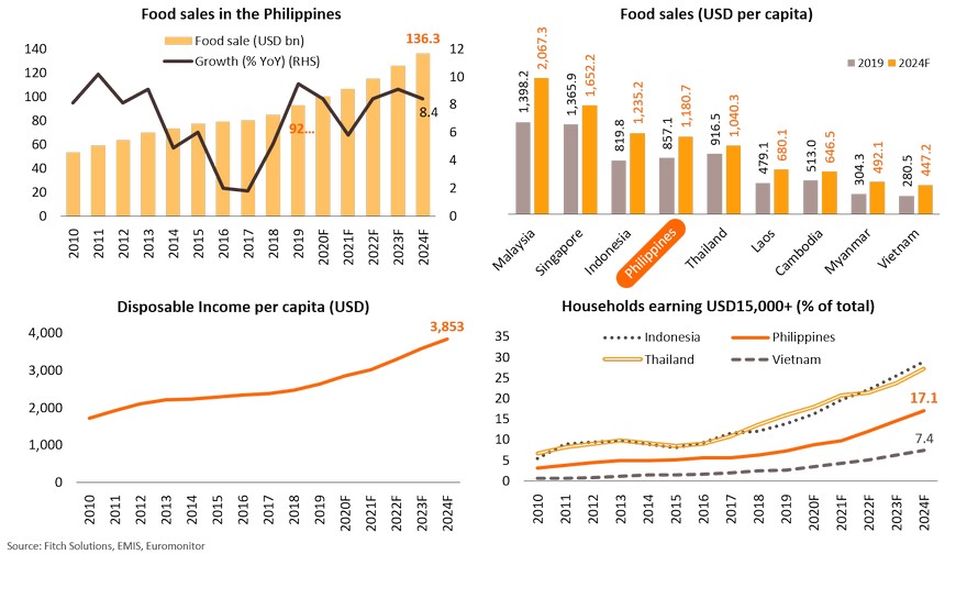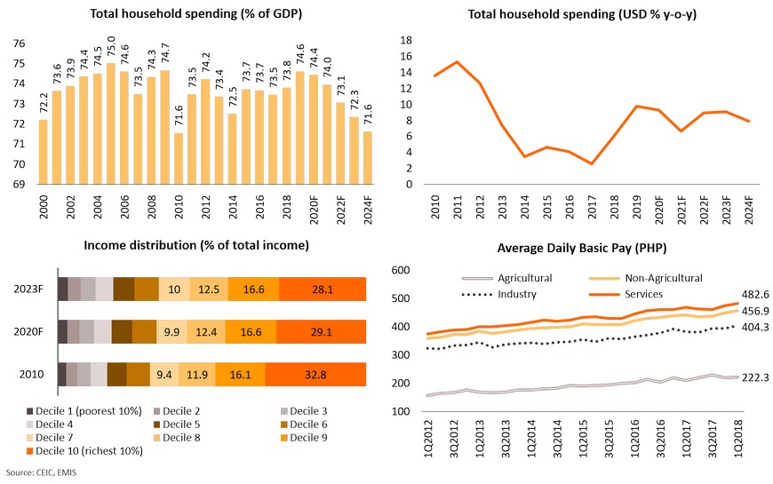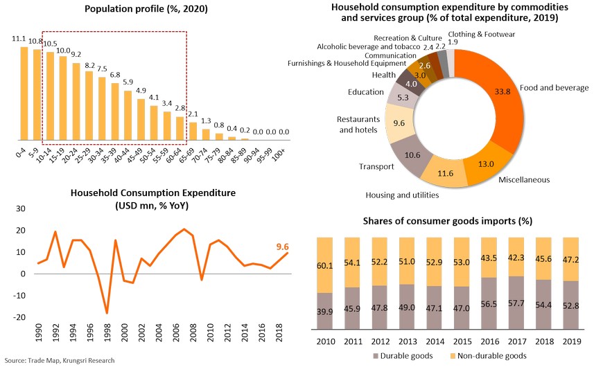 Household consumption which currently accounts for about 73.2% of nominal GDP (as of 2019) is expected to be a main driver for the Philippines’ growth over the periods ahead. Sustained and strong economic growth in the last decade results in rising annual household earnings and annual disposable income per capita which is expected to reach USD3,859 in 2024. And, over the 2020s, over 50% of the population is in the working age (below 64 years old) and this favorable structure of population will be a great boon to the country’s domestic consumption.