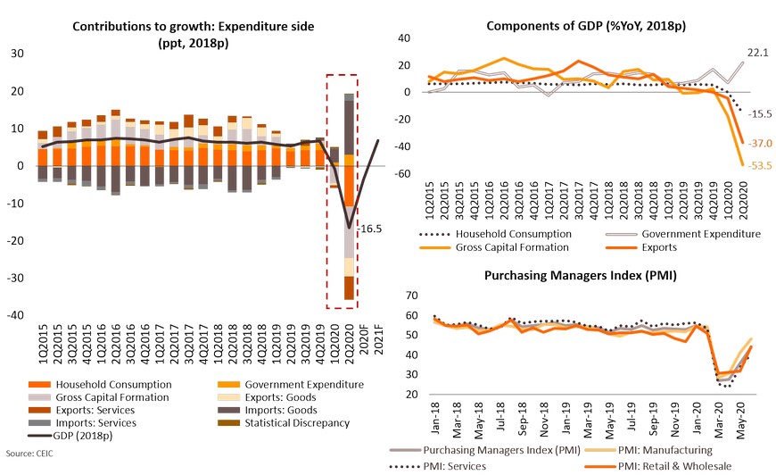 Growth slump in 2Q20 depicts the severe impact of the pandemic on the economy; however, the economy should slowly recover starting from 2H20