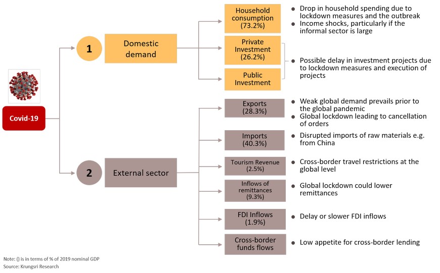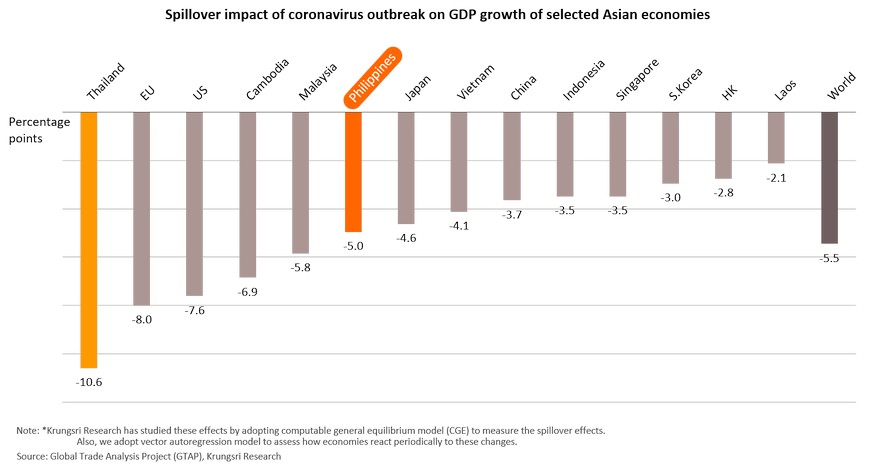 The outbreak would reduce global GDP growth substantially by 5.5ppt from baseline forecast (pre-outbreak). Krungsri Research now projects the outbreak would pose a negative impact to the Philippines’ economy of 5.0 ppt, which is relatively significantly compared to that of regional peers in ASEAN. The impact of the pandemic to the economy is passed through different channels – tourism, supply disruption at home and abroad, and multiplier effect.