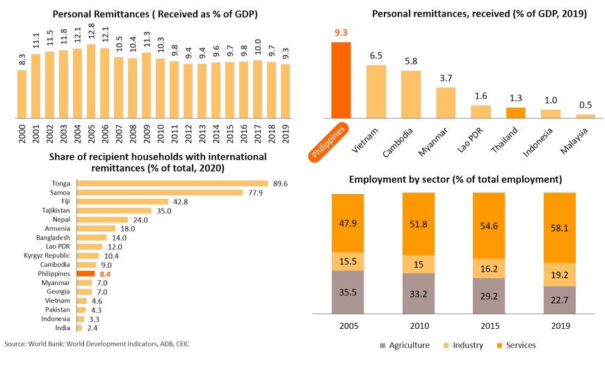 Remittances which currently account for about 9.3% of the Philippines’ GDP have played a crucial role by being a main source of income for a number of households in the Philippines or around 8.4% of the total households, according to the figure provided by the ADB. We expect that inflows of remittances should resume strongly once the pandemic is effectively contained and the global economic activity starts to recover in the medium term.