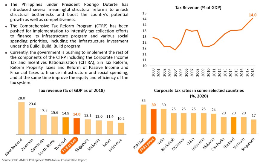 Currently, the corporate income tax (CIT) of the Philippines is the highest among peers in ASEAN, 30% compared to that of Singapore of 17% . Although the government is implementing the CIT reforms to promote both domestic investment and FDI, it will take at least 5 years to become competitive regionally. This is because the CIT rates is reduced to 20 percent in annual increments of 1 percentage point over a 10-year period starting in 2020 according to the Corporate Income Tax and Incentives Rationalization Act (CITIRA) introduced in September 2019.