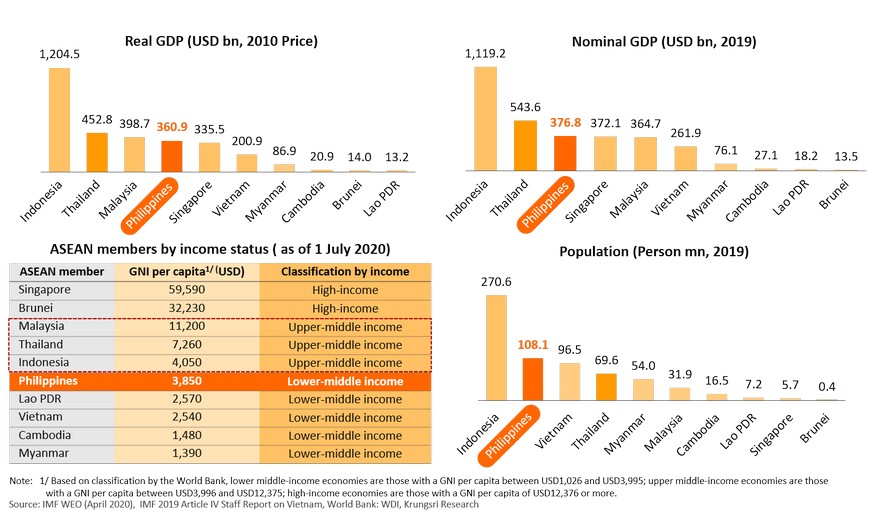 The Philippines is currently listed as an lower-middle income country with the GNI per capita of USD3,850 (still slightly below the upper bound of a lower-middle income group of USD3,995) by the World Bank in July 2020. High economic growth over the last decade with the annual growth rate of around 6.3% leads to a continuous increase of Filipinos’ GNI per capita. With the strong growth momentum, the country aims to achieve the upper-middle income country status by 2020.