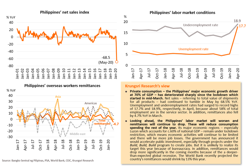 • The lockdowns across the region to contain the COVID-19 outbreak had stalled most manufacturing activities. Tumbling businesses earnings, weak global and regional demand, and expectations of a global economic recession will prompt investors to postpone investment plans. According to UNCTAD (United Nations Conference on Trade and Development), greenfield investment in Asia fell by 37% YoY in 1Q20 while the number of mergers and acquisitions (M&A) had dropped by 35% YoY, as of April. UNCTAD estimates FDI inflows to Developing Asia would contract by 30-45% YoY in 2020, following a 5% drop in 2019.